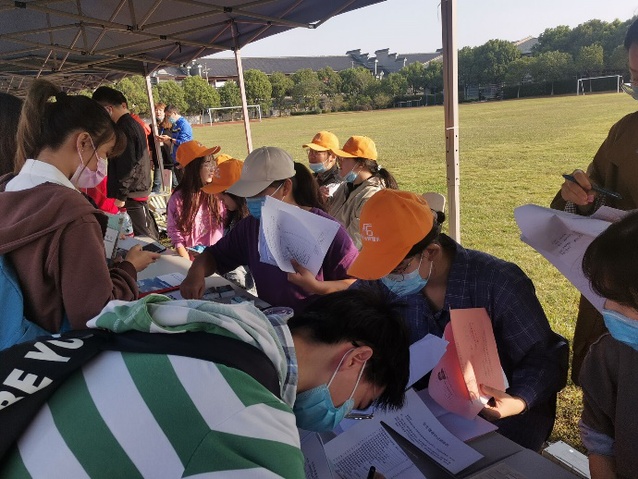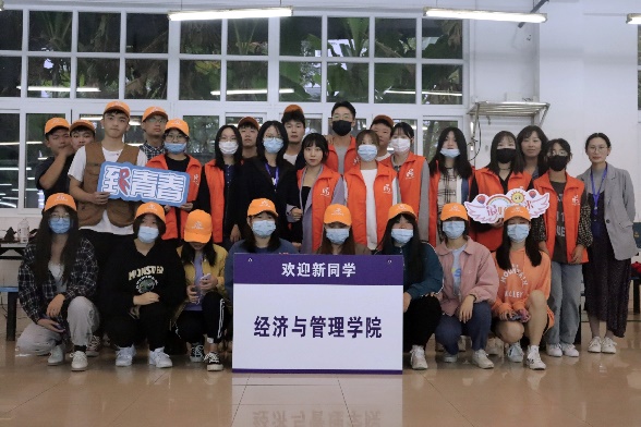 2020级新生根据不同的到校方式分别被安排到经济与管理学院在食堂、操场所设的专业报名点。在经济与管理学院的报道处,我们可以看到穿着橙色志愿者服装的同学们有条不紊的提供着志愿服务,努力给每位新生提供到帮助。