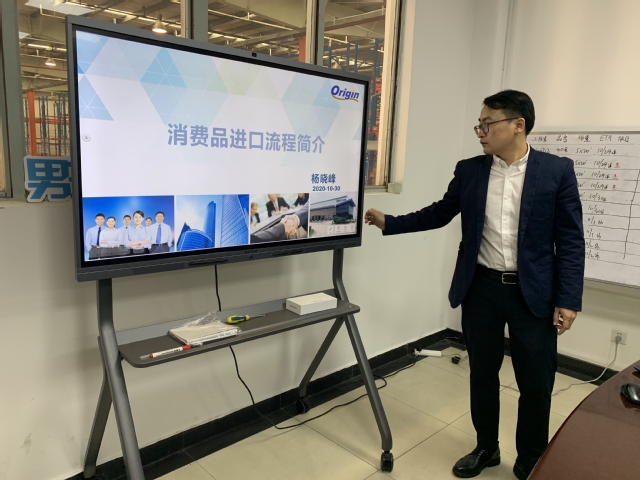 食品业务部经理杨晓峰,为师生们详细介绍了消费品进口流程,第一部分是食品贸易的现状、信息来源分享;第二部分是进口整体流程简介、物流方案背后的秘密;第三部分是中文标签制作、LMS标签系统、海关申报单证制作、OMS制单操作、国际贸易单一窗口使用等;第四部分是乳制品进口案例。