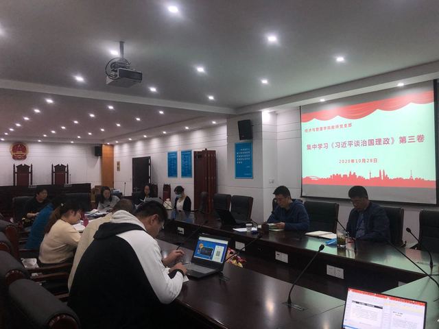 10月28日下午,经济与管理学院教师党支部组织开展“集中学习《习近平谈治国理政》第三卷”主题党日活动。党支部书记刘柯杰老师首先传达“上海电子信息职业技术学院深入学习《习近平谈治国理政》第三卷、《习近平总书记教育重要论述讲义》工作方案”的主要精神,并简要介绍支部学习计划。