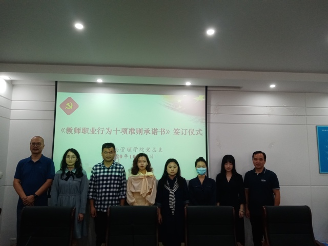 2020年10月14日,经济与管理学院在I106会议室开展了新进教师《教师职业行为十项准则承诺书》签约,仪式由党总支副书记王冬梅主持。王冬梅副书记要求新进教师要认真遵守承诺书内容,坚定政治方向,自觉爱国守法,传播优秀文化,潜心教书育人。