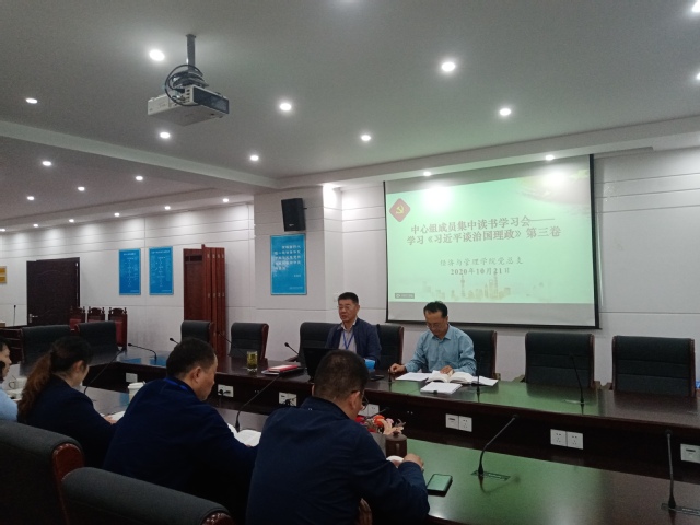 2020年10月21日,经济与管理学院党总支召开中心组学习会,学习会内容为学习《习近平谈治国理政》第三卷——用新时代中国特色社会主义思想铸魂育人。会议由经济与管理学院党总支书记蔡军林主持,学习形式为采用领读和研讨发言相结合。中心组成员结合自身工作实际,表示课堂教学要传党的理论政策之声、党的实践探索之声;在读原著、学原文、悟原理的基础上,要厚植马克思主义等相关人文社会科学的理论基础,加强理论文字转化为生活语言的训练,增强提取、表达、宣讲各种理论、政策、文件的能力,不仅及时高效把党的理论、政策宣传下去,而且是有温度地把政策文字转换成通俗语言,讲出、讲好中国故事。