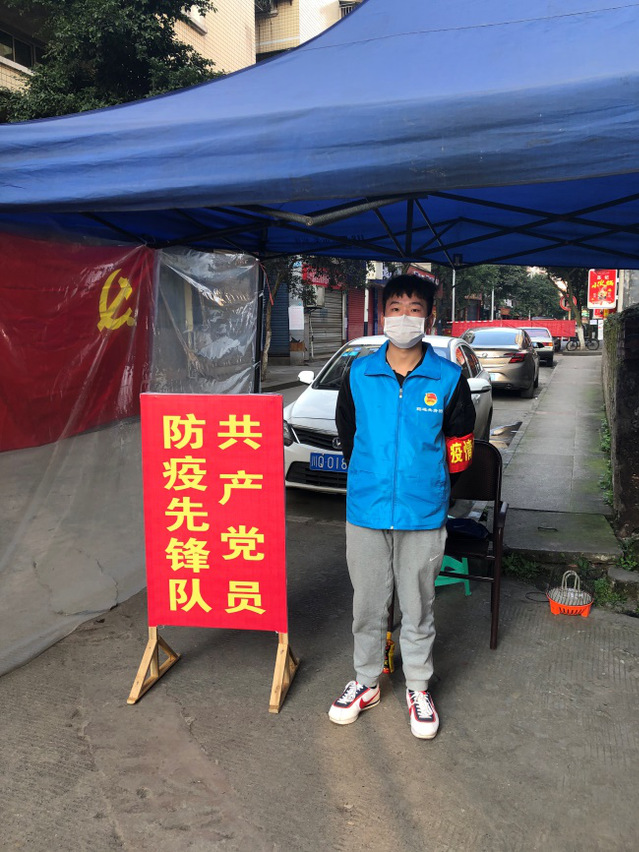 在疫情防控爆发期间,在县政府号召和家人的支持下,经济与管理学院191会计3班张世钊。张世钊不惧疫情风险、主动请缨,加入了筠连县中城社区开展志愿服务,目前成为了一名在中城社区幸福街检查点的志愿者。他用行动接受着考验,践行着新时代青年的初心和使命。进行志愿服务。