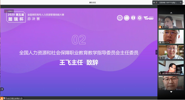 总决赛的开幕式,我们有幸邀请到主办方全国人力资源和社会保障职业教育教学指导委员会王飞主任、高尚秘书长、副主任李琦教授,承办院校代表云南交通职业技术学院晏杉副院长、上海踏瑞计算机软件有限公司创始人兼总经理朱营先生为从区域赛中晋级的参赛团队、教师们致辞,致以最热烈的欢迎及最诚挚的感谢。参赛的选手、老师与开幕式嘉宾虽分布在全国不同的地方,但通过小小的电脑、手机屏幕,依然可以感受到所有人的热情。