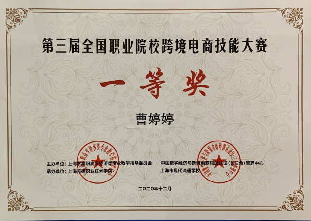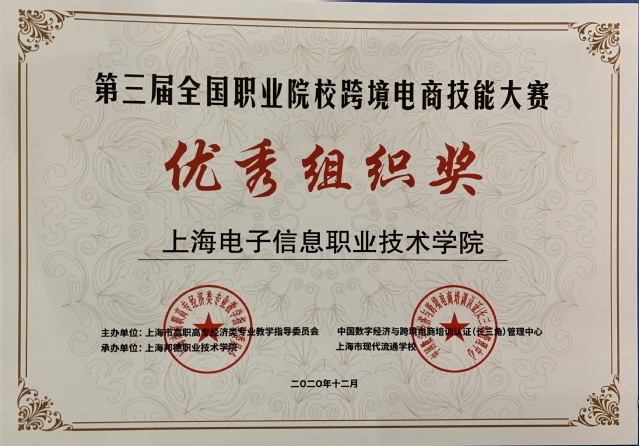 2020年12月26日,上海市高职高专经济类专业教学指导委员会和中国数字经济与跨境电商培训认证(长三角)管理中心主办的“第三届全国职业院校跨境电商技能大赛”在上海邦德职业技术学院圆满收官,我校经济与管理学院2019级学生曹婷婷获一等奖,2020级跨境电商专业李冰、张思慧等六名同学获二等奖,2019级学生谢莉芳、申春燕等十名同学获得三等奖,杨奕、刘计育、汪晓君三位教师获得“优秀指导教师”,我校获得了优秀组织单位奖。