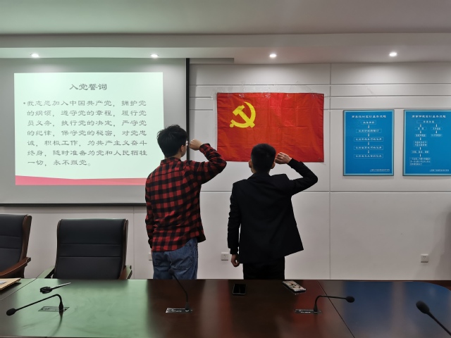 入党宣誓在雄壮的国际歌中开始,支部内2名预备党员及10名正式党员面向党旗,举起右手,在支部书记殷菲同志的领誓下,向党旗庄严宣誓,表达自己对党的忠诚和为共产主义奋斗终身的决心。随后,2名预备党员依次做表态发言,吴健辉同志讲到,一定不忘入党志愿书上所写的内容,对照党章争做合格的共产党员。程杰同志谈到,将继续不忘初心、牢记使命,对党忠诚,刻苦钻研,时刻以党员的标准要求自己,发挥好先锋模范作用,随时听从党的召唤,报效祖国!