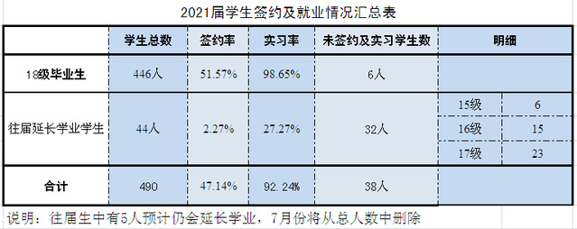我院2021届毕业生共有490人,其中2018级毕业生446人,延长学业的学生为44人。截至2021年4月15日,已实习学生452人,实习率是92.24%;已签约学生数230人,签约率46.94%,合同就业1人。各专业的签约及就业情况如下: