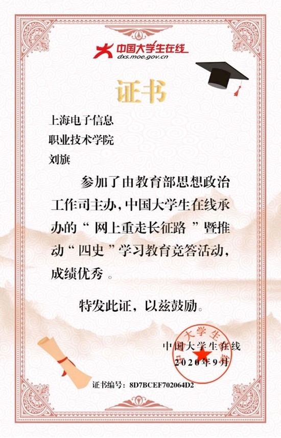 同时,191人资1团支部书记刘旗同学积极学习“四史”,在中国大学生在线承办的“网上重走长征路”暨推动“四史”学习教育竞答活动中表现优异,获得了优秀证书。