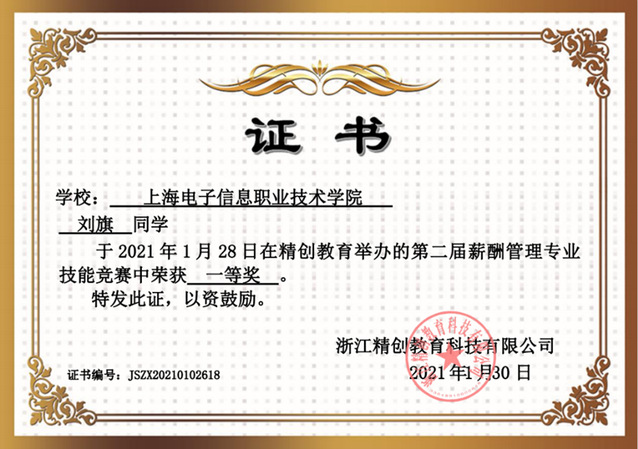 191人资1团支部书记刘旗同学始终保持着激昂的斗志和饱满的热情,入校来积极参加各类活动和比赛,她于2020年5月获得“第一届全国精创教育培训与开发专业技能竞赛”一等奖;2020年6月获得“第五届全国大学生学术英语词汇竞赛”二等奖;2020年6月获得第一届上海市大学生“精创教育杯”人力资源管理技能挑战赛二等奖;2021年1月获得“第二届全国精创教育培训与开发专业技能竞赛”特等奖;2021年1月获得“第二届全国精创教育招聘与甄选专业技能竞赛”特等奖;2021年1月获得“第二届全国精创教育薪酬管理专业技能竞赛”一等奖等27项殊荣,其中含校级奖项14项。她用一张张证书书写着认真、用心、奋斗的学习足迹。
