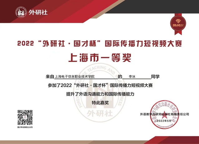 5月16日,2022“外研社·国才杯”国际传播力短视频大赛初赛成绩公布。我院20级中英教改班章晓霞老师带队的“We are family队”(参赛同学:萧稔于、马佳琪、李冰和韩旭)参赛作品力压众多本科院校英语专业学生、勇夺上海赛区一等奖,成功晋级全国复赛。