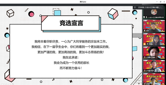 随后,会议进入了中心环节,易班换届竞选工作正式开始。本次竞选采用线上公开演讲答辩的方式进行,竞选人精心制作了演讲PPT,分别就未来的工作设想及个人优势等方面进行演讲,各评委从个人形象展示、自我介绍、竞选目的、工作设想、语言风度及问答环节进行综合打分,择优录取。