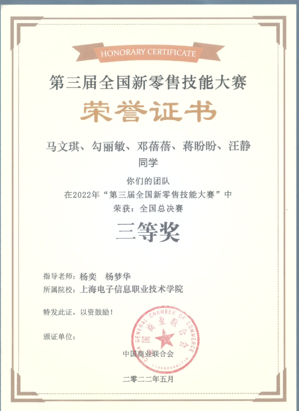 近日,2022第三届全国新零售技能大赛最终决赛成绩出炉了,由上海电子信息职业技术学院经济与管理学院学生马文琪、勾丽敏、邓蓓蓓、蒋盼盼、汪静组成的“静水深流队”,以决赛84.61分荣获全国三等奖。