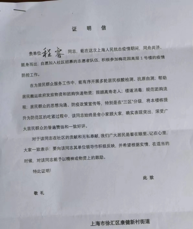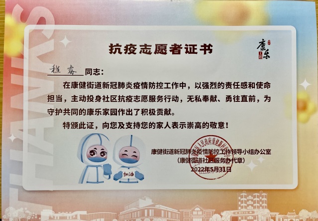 程睿老师化身为最可爱的“大白”和“小蓝”为所在社区居民群众服务。她风雨无阻的协助运送生活物资,挥汗如雨;她勇敢挑起核酸采样、环境消杀的重担,认真严谨;她关爱邻里、想尽办法温暖身边需要帮助的人,热情爽朗。她勇于成为默默无闻的“逆行者”,是康乐家园的“守护者”,和社区一起成为这个春天最温暖的记忆。在社区携手并肩的战“疫”中,居民感受到了志愿精神绽放出的至善至美的人性之光,她也得到了居民群众的一致认可和感谢。