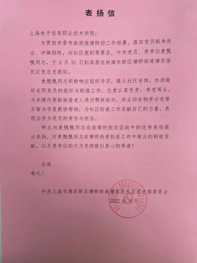 史悦悦老师积极响应组织号召,于3月31日主动到浦东新区塘桥街道塘东居民区党总支报道。在疫情防控工作中,她服从社区安排,协助做好在职党员的组织与联络工作,态度认真负责,考虑周全。她与本楼内高龄独居老人进行帮扶结对,并主动在物资分发等方面为邻里提供帮助,为社区防疫工作贡献自己的力量,表现出作为党员的责任与担当。