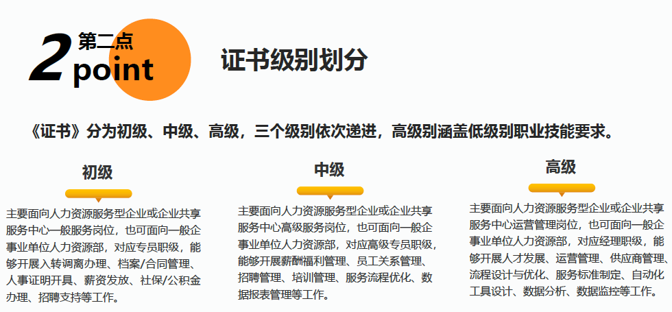 高级证书主要面向人力资源管理、行政管理、社会保障事务、信息系统管理等岗位的工作,通过认证的人员应掌握大型、集团型企业行政组织搭建(包括人力资源共享中心搭建)、集团人才战略规划、员工管理制度规划、绩效考核体系规划、假期与考勤管理制度规划、集团薪酬体系规划、人力资源共享服务规划、管理者分析等知识与技能,具备大型集团企业人力资源管理体系规划、运营与管理的能力。