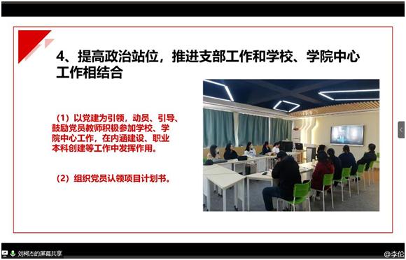 党委组织部吴淑芳老师最后谈到,三个支部准备充分,严格按照要求进行总结一年的工作,各支部在2022年度的支部学习,本职工作开展,学习制度落实等方面做客观全面的总结。支部能围绕中心工作抓党建,教师党支部项目计划书的落实,学生党支部在就业、征兵、学生思想建设等方面起到了引领作用,党总支对支部工作指导到位。