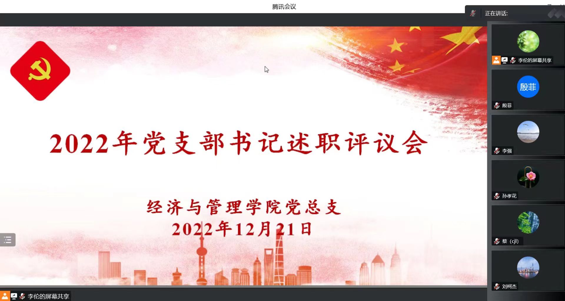 为进一步加强党支部的思想建设、组织建设,落实党支部书记抓基层党建工作责任,2022年12月21日下午,经济与管理学院党总支召开党支部书记述职评议会。党总支副书记王冬梅主持,党总支委员、党员代表参加会议,组织部吴淑芳老师受邀参加指导。