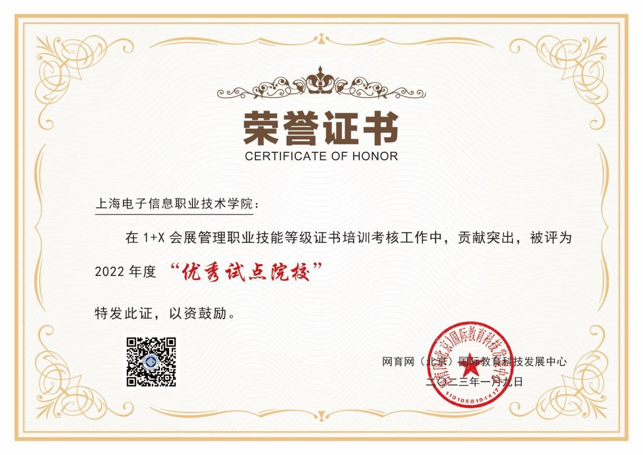 近日,教育部“1+X”证书制度试点单位、职业教育培训评价组织——网育网(北京)国际教育科技发展中心,对上海电子信息职业技术学院开展的培训与考证工作予以高度评价,授予学校“2022年优秀试点院校”荣誉称号。
