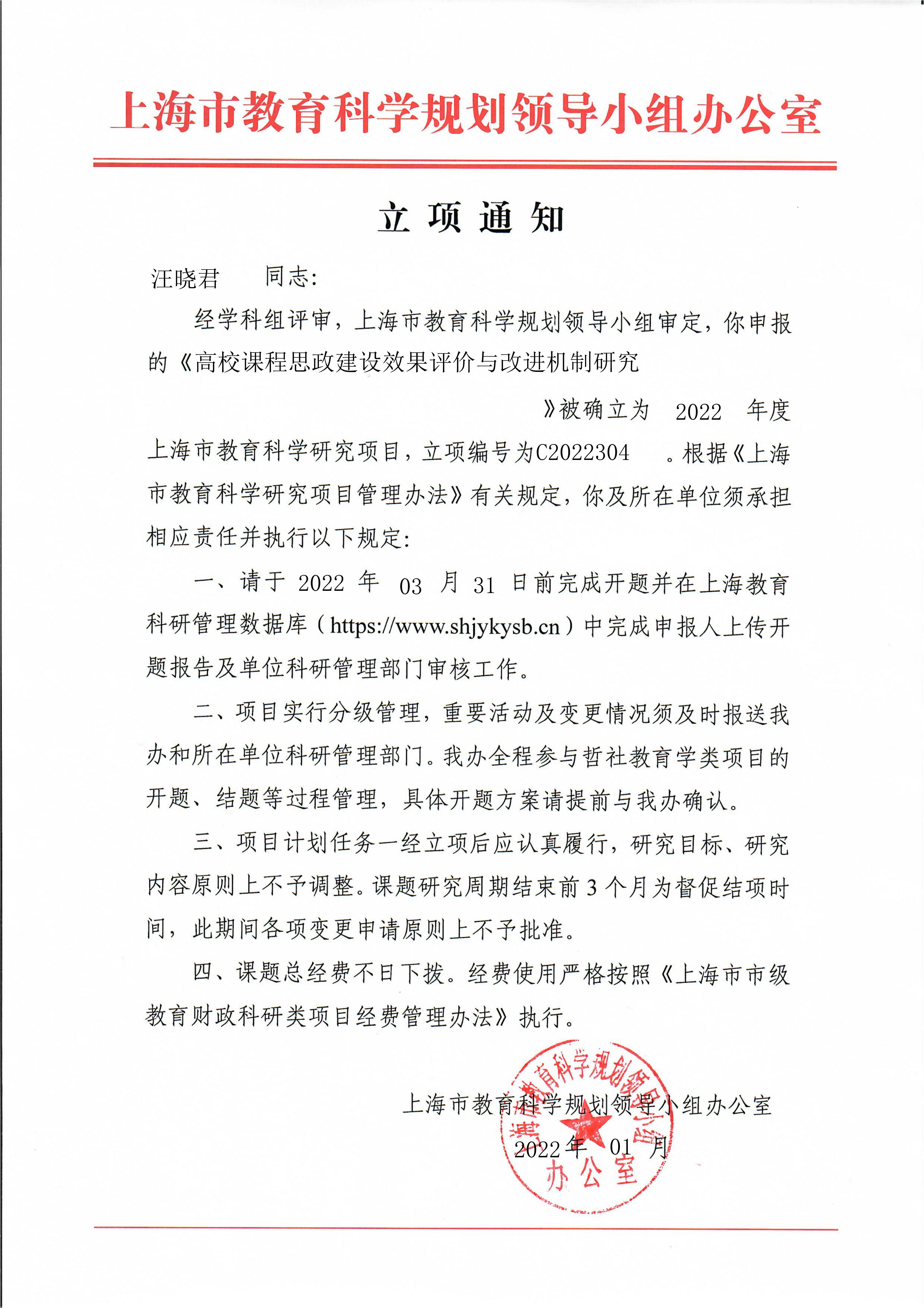 根据上海市教育科学规划领导小组办公室立项通知,我院汪晓君老师的《高校课程思政建设效果评价与改进机制研究》(立项编号:C2022304)被确立为2022年度上海市教育科学研究项目。