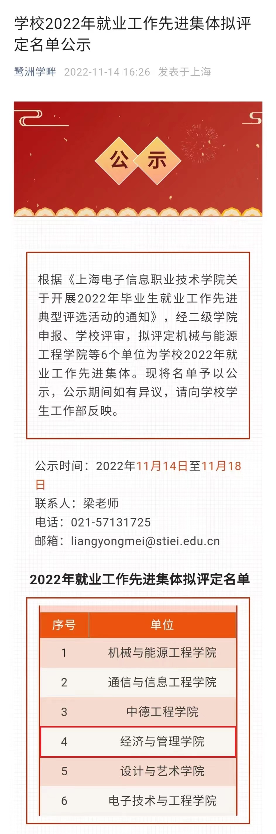 经济与管理学院根据《上海电子信息职业技术学院关于开展2022年毕业生就业工作先进典型评选活动的通知》,积极申报,经学校评审,获评“2022年就业工作先进集体”。