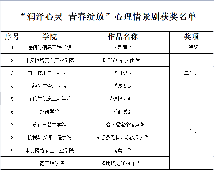 为加强学生心理健康教育,提升学生心理品质,充实学生大学生活和体验,根据学院《关于开展2023年“润心育德”心理健康教育活动月的工作通知》要求,经济与管理学院“心语南苑”工作站于2023年4月举办了“润泽心灵青春绽放”心理情景剧大赛。经过初赛评选、决赛现场展演等环节,评选出一等奖一名,二等奖三名,三等奖六名,现予以公示。