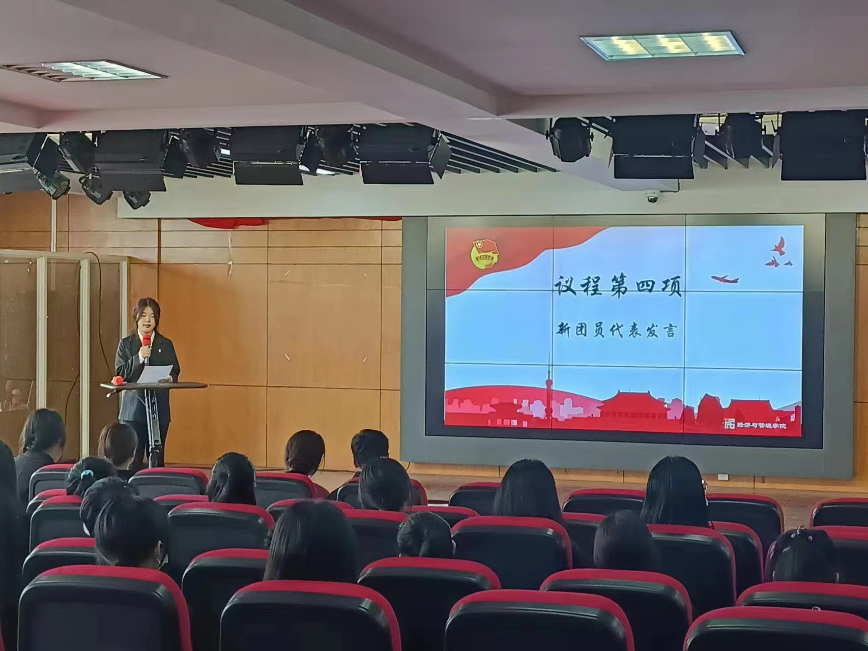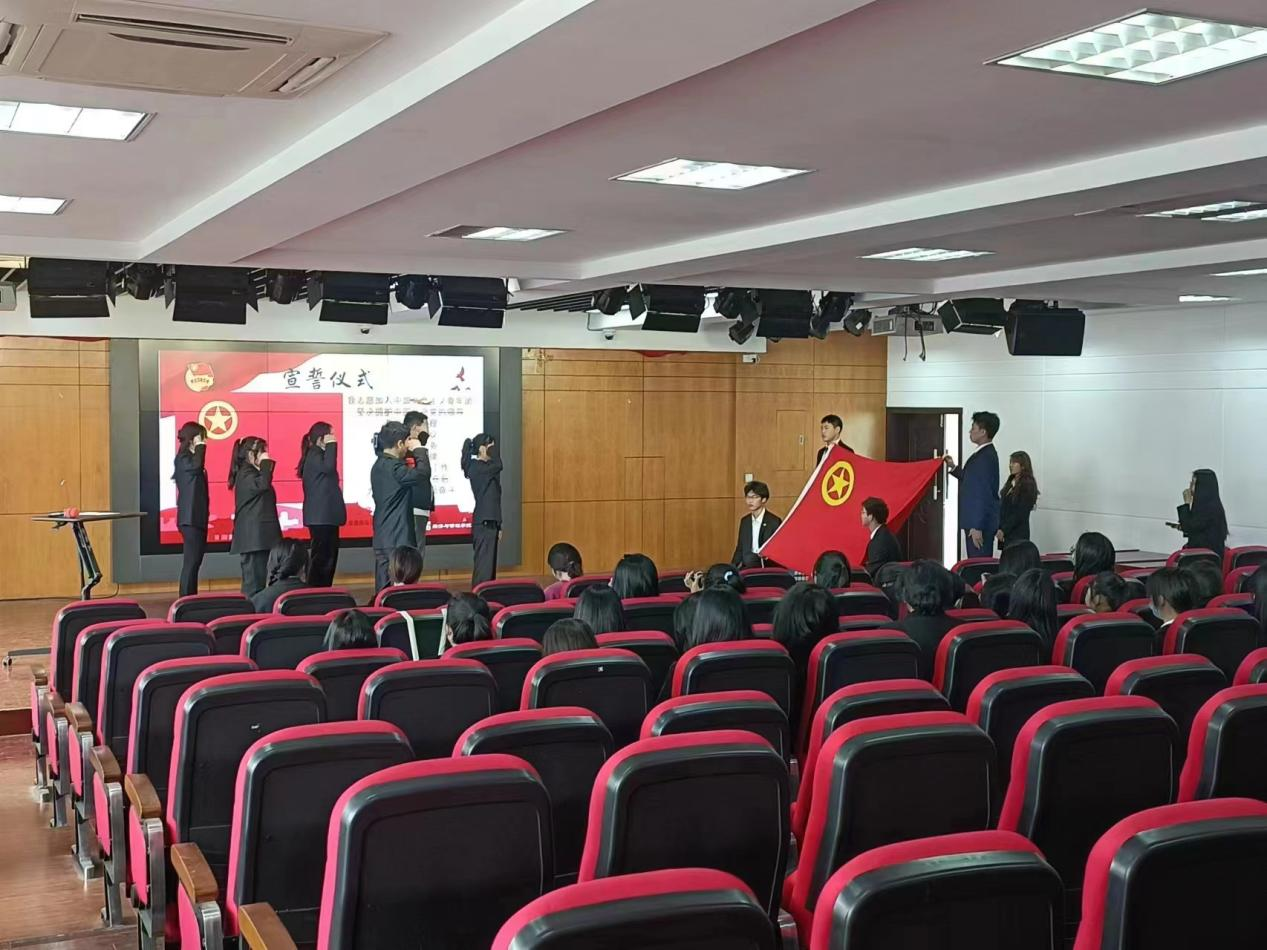 新团员代表祝申怡同学发言表示:“我们要珍惜青春年华,珍惜时代赋予我们的宝贵机遇,用自己的双手担负起历史的职责,用坚定的信念撑起中华民族时代精神的脊梁,这是我们每个团员心中所立下的誓言。”