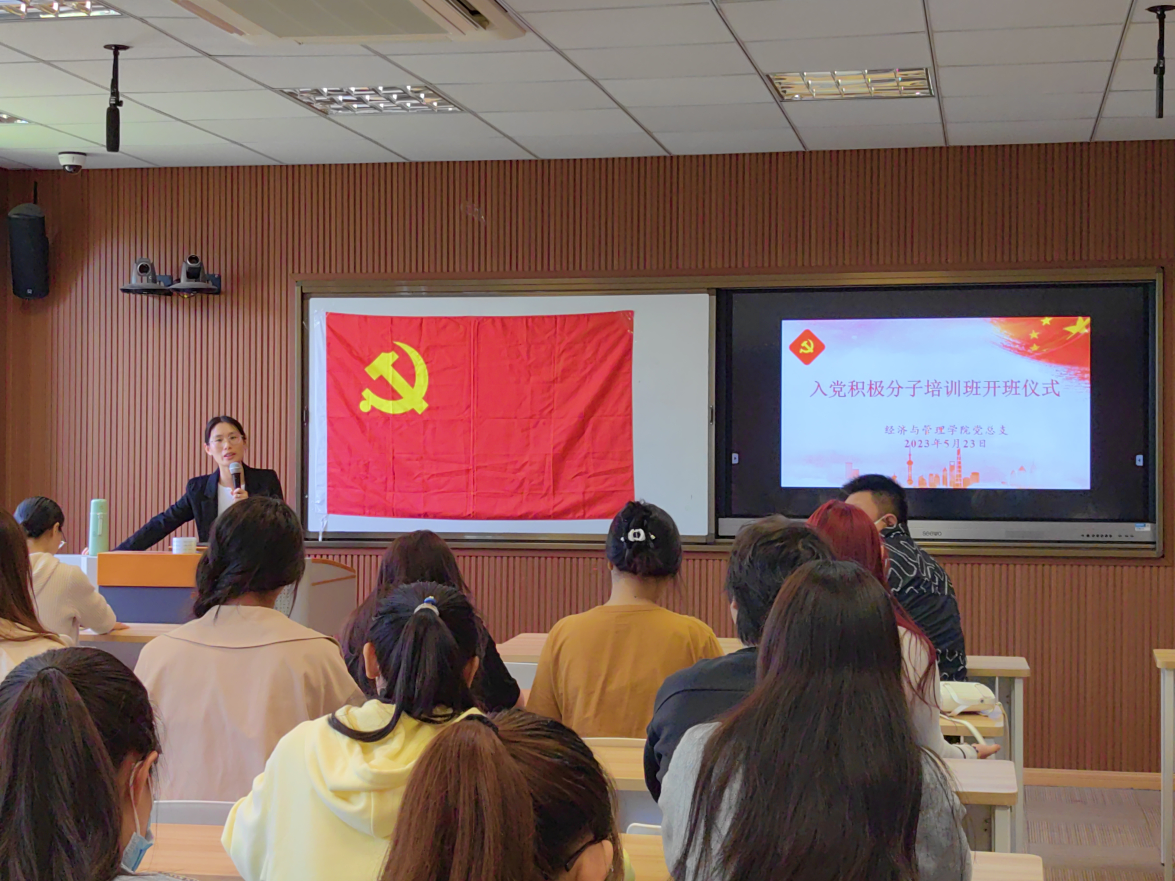 在全校上下深入开展学习贯彻习近平新时代中国特色社会主义思想主题教育之际,为进一步做好发展党员工作,切实加强入党积极分子的培养教育,确保发展党员的质量,经济与管理学院于5月23日在H310教室举办入党积极分子培训班开班仪式。经济与管理学院党总支副书记王冬梅、经济与管理学院学生党支部党员及39名入党积极分子参加本次开班仪式,开班仪式由学生党支部书记殷菲主持。