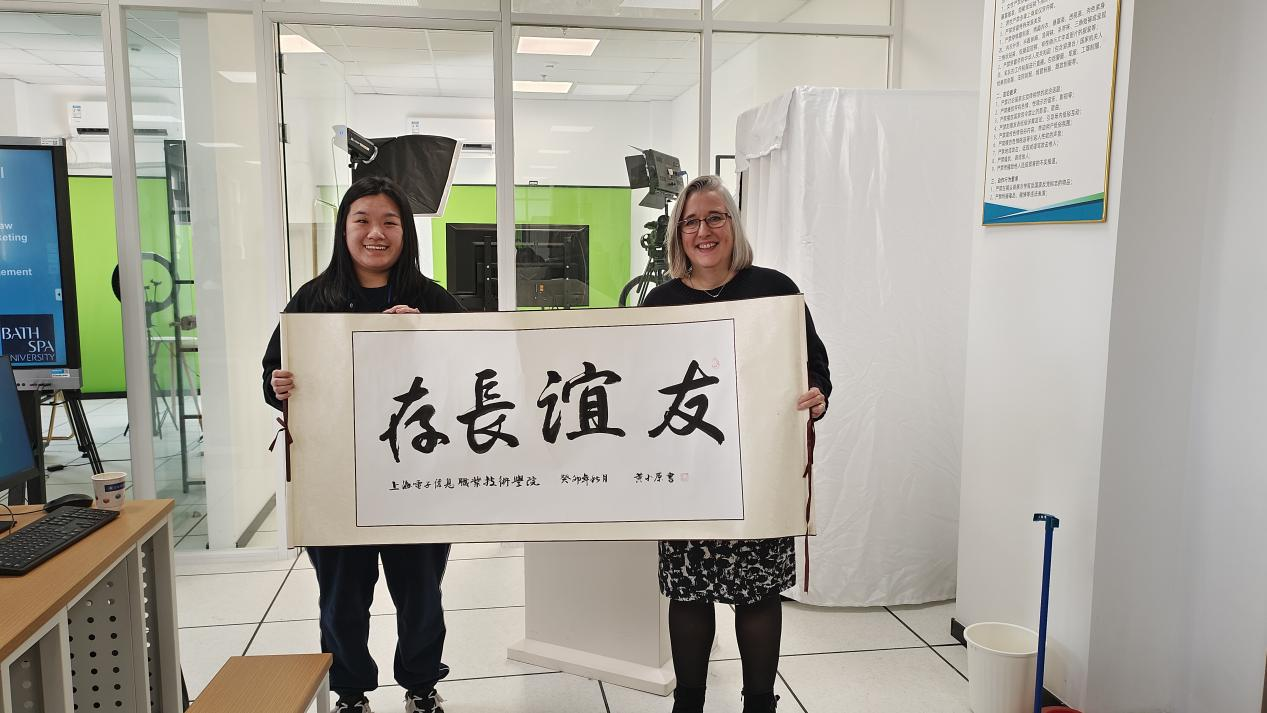 最后,来自23级中英合作教改班级的黄小原同学代表上海电子信息职业技术学院馈赠英方教师一幅写有“友谊长存”的书法作品作为礼物,祝贺中英合作17年的良好发展和有效成果。