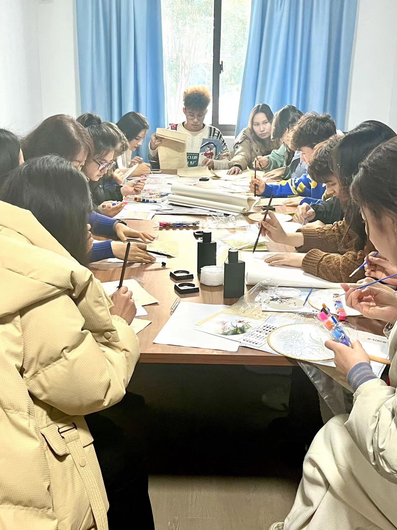 随后在老师们的带领下大家纷纷进行书法、动手制作团扇,大家有条不紊的进行,搭配色彩、细致临摹,从构图到粘贴制作,同学们还交流着绘画心得,随着色彩的填涂,细节上的修补,团扇都陆续制作完成,大家纷纷分享、展示自己的团扇作品。