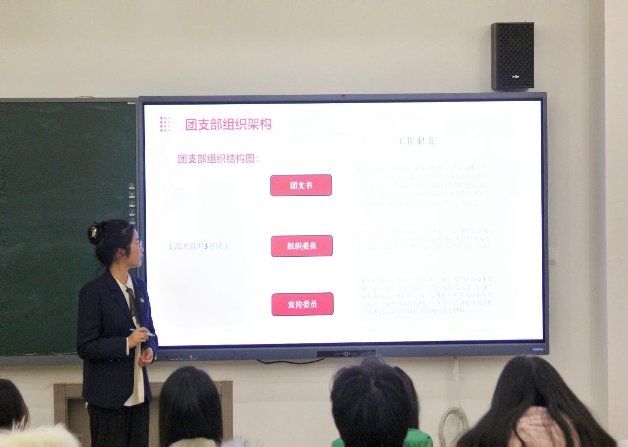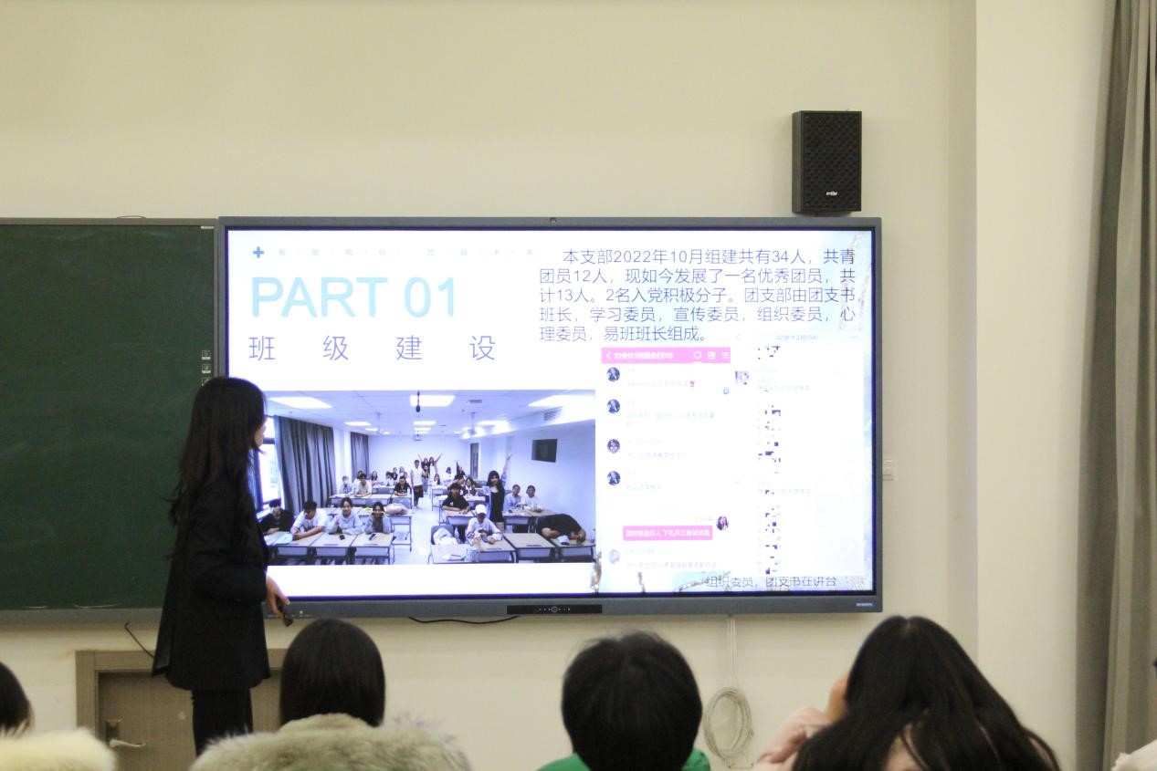 本次团支书工作述职评优大会由经管22级各专业班级的团支书依次上台作报告,经济与管理学院团总支负责人鲍昱含老师、团总支各部门部长以及经管学院22级团支书和23级各班团支部成员参加此次会议。