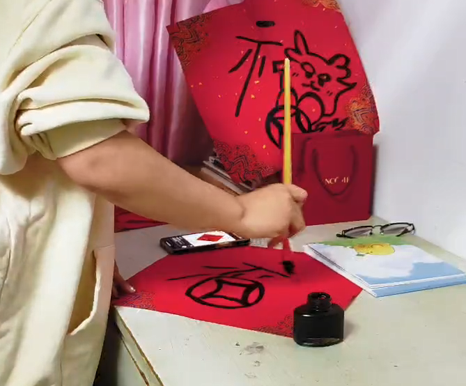“阵阵墨香指尖流,幽幽韵味心脾沁。”春联纸、毛笔和砚台整齐地摆放在桌子上,鲜红的纸张渲染着浓浓的节日氛围。“市场上买的福字虽然金光闪闪,图案漂亮,但还是用毛笔手写的福字更有年味!”写福字的同学高兴地说。