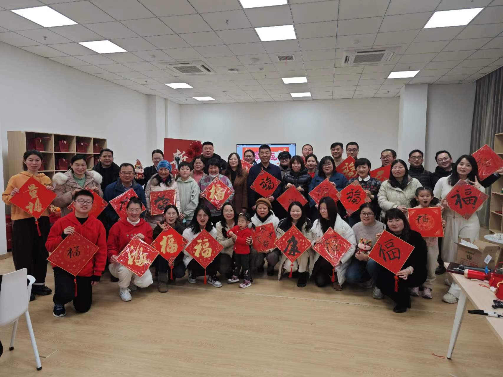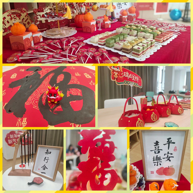 接下去到了茶话会最吸引人的游戏互动环节,此次“携手共奋进”迎新系列活动,学院工会筹备了丰富多彩的团建活动,所有人都被派发了一张红福字留空宣纸卡,大家用毛笔撰写“福”字,祝福新的一年福气满满。茶话会上还进行了其它诸如双龙戏珠接力赛、动作接龙、扯龙尾等与即将到来的龙年寓意相关的游戏。