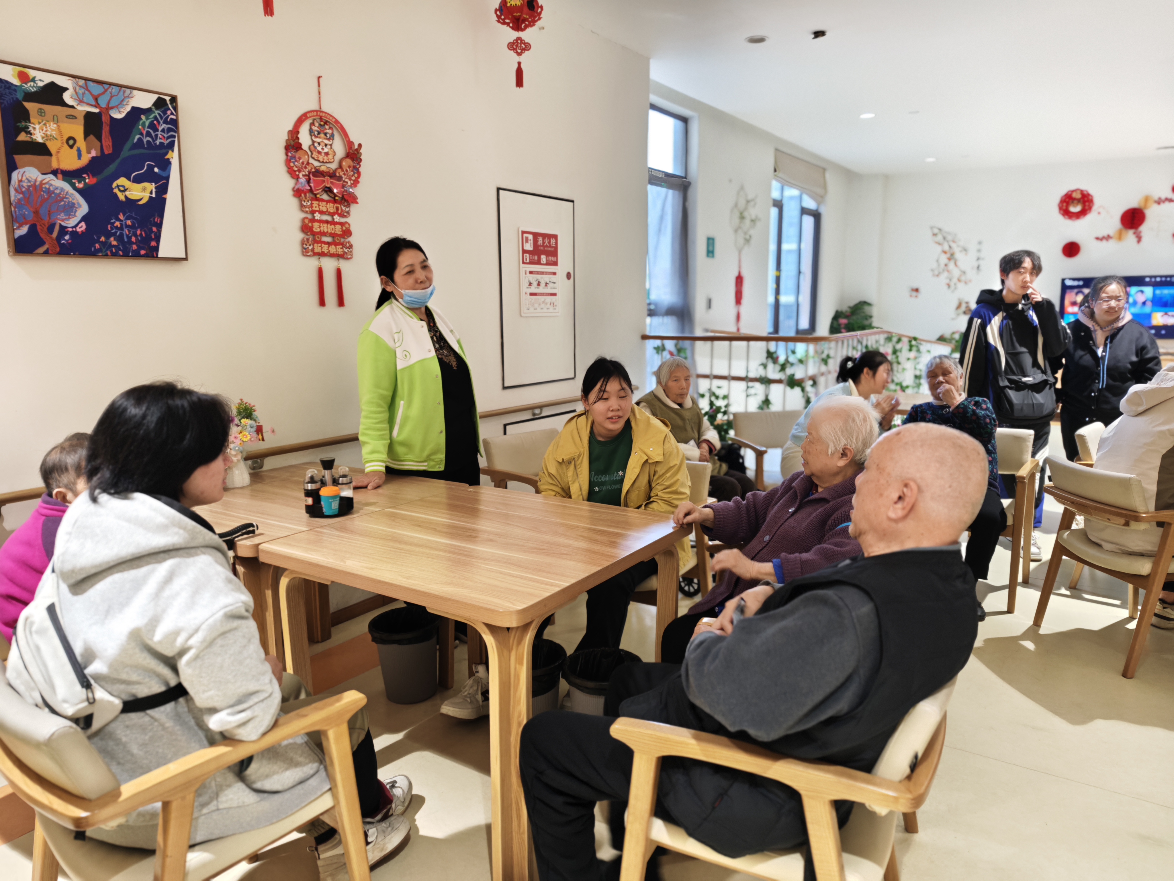 活动室桌椅区域设计剪纸互动,热情地邀请老人们参与。他们微微颤抖的双手在志愿者的帮助下,小心翼翼地握着剪刀,慢慢地剪出爱的形状。剪纸时,那专注的神情、亲切的互动,构成了一幅充满爱与关怀的动人画面。