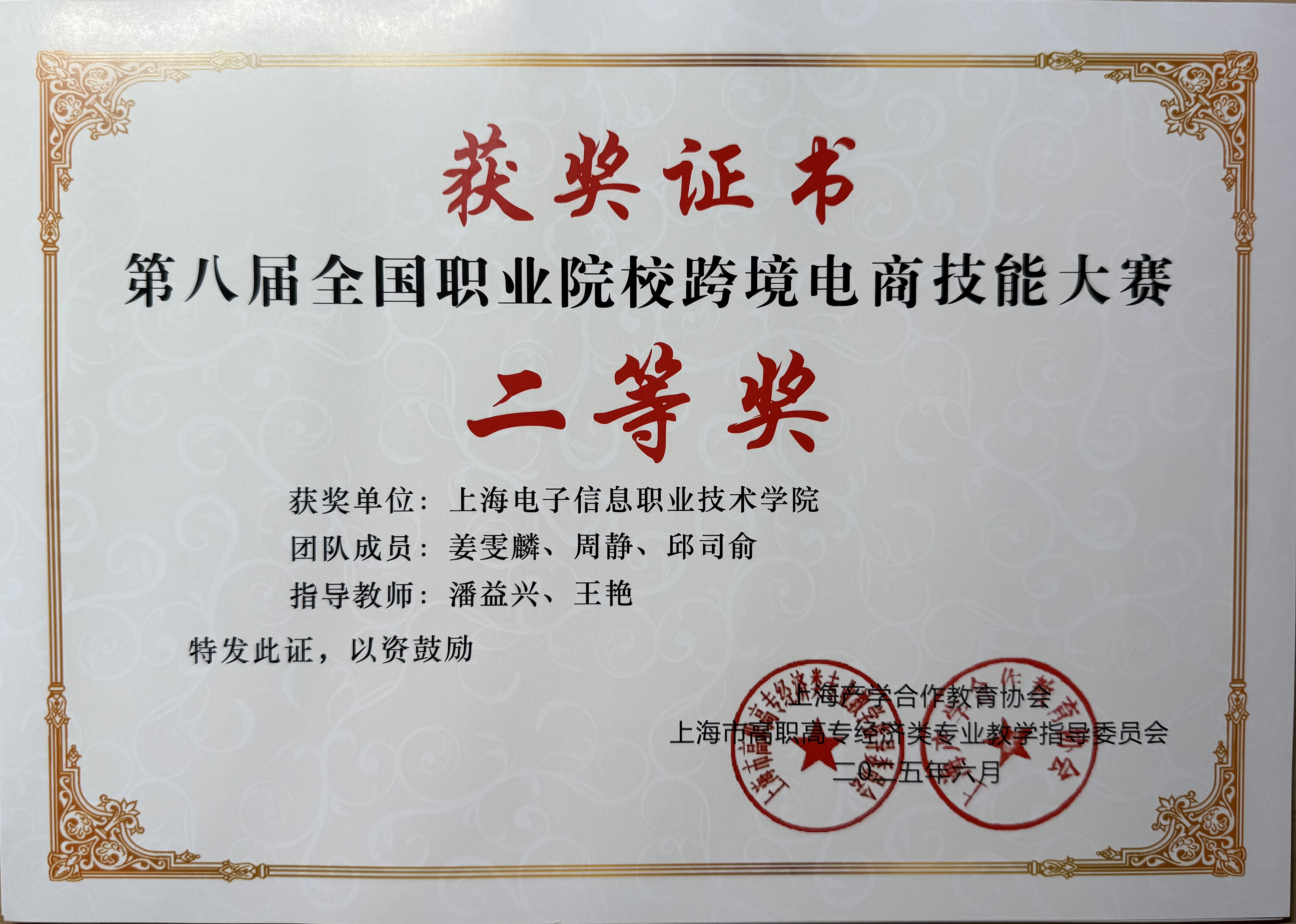 本届大赛由上海市高职高专经济类专业教学指导委员会、上海产学合作教育协会联合主办,旨在提升职业院校学生跨境电商专业技能,深化产教融合,服务国家“丝路电商”发展战略。赛事吸引了全国29个省市、202所学校共6424名学生报名参与,众多职业院校及应用型本科高校的优秀学子同台竞技,竞争激烈。经过初赛的严格筛选和决赛的激烈角逐,由杨雨晴、侯亚雯、余珍珠同学组成的团队凭借在跨境电商平台运营、选品推广、物流供应链管理等环节的卓越表现,勇夺一等奖。由姜雯麟、周丹、邱司俞同学组成的另一支队伍同样发挥出色,荣获二等奖。他们的优异表现充分展现了我校学子精湛的职业技能和昂扬的精神风貌。