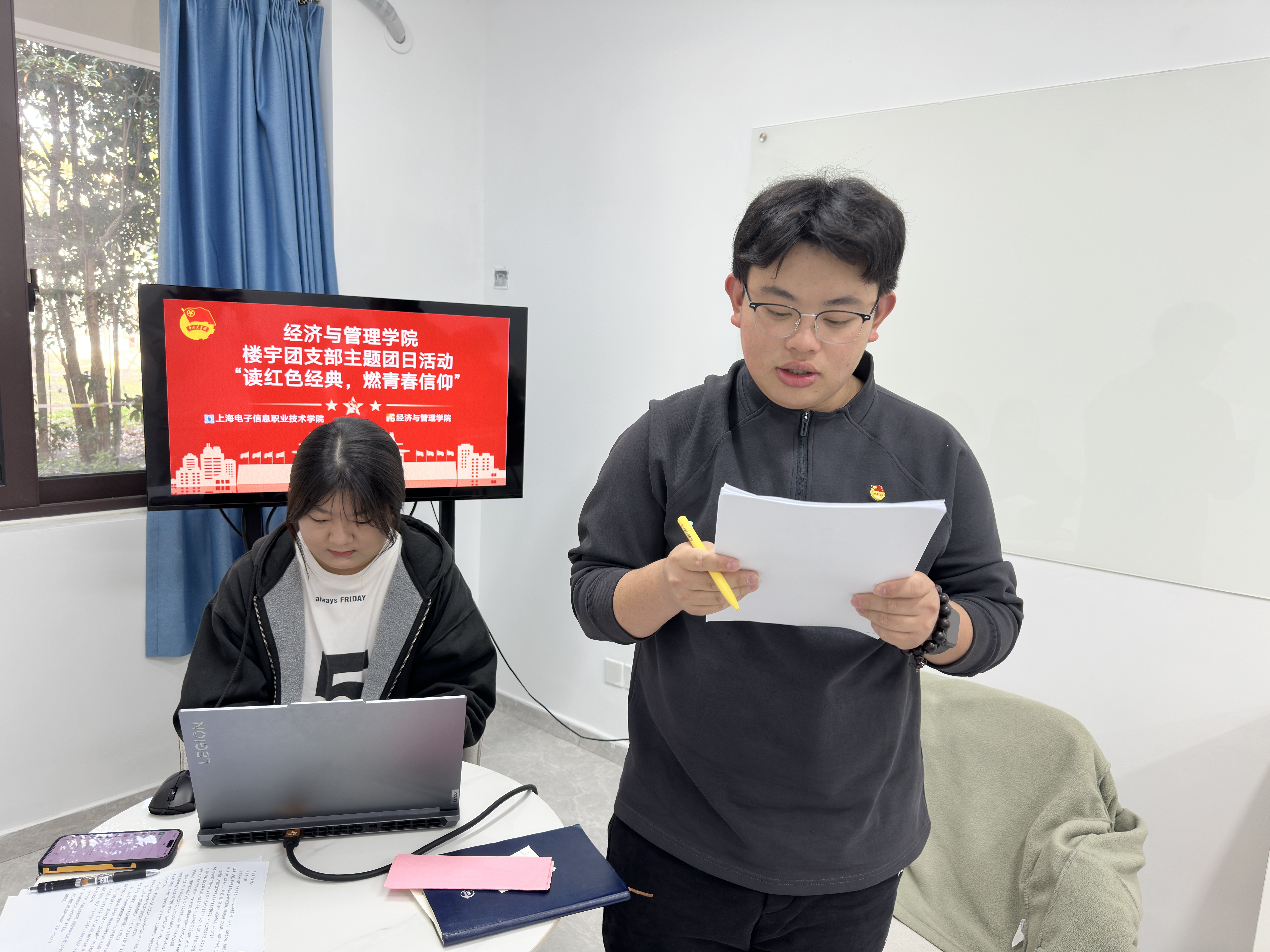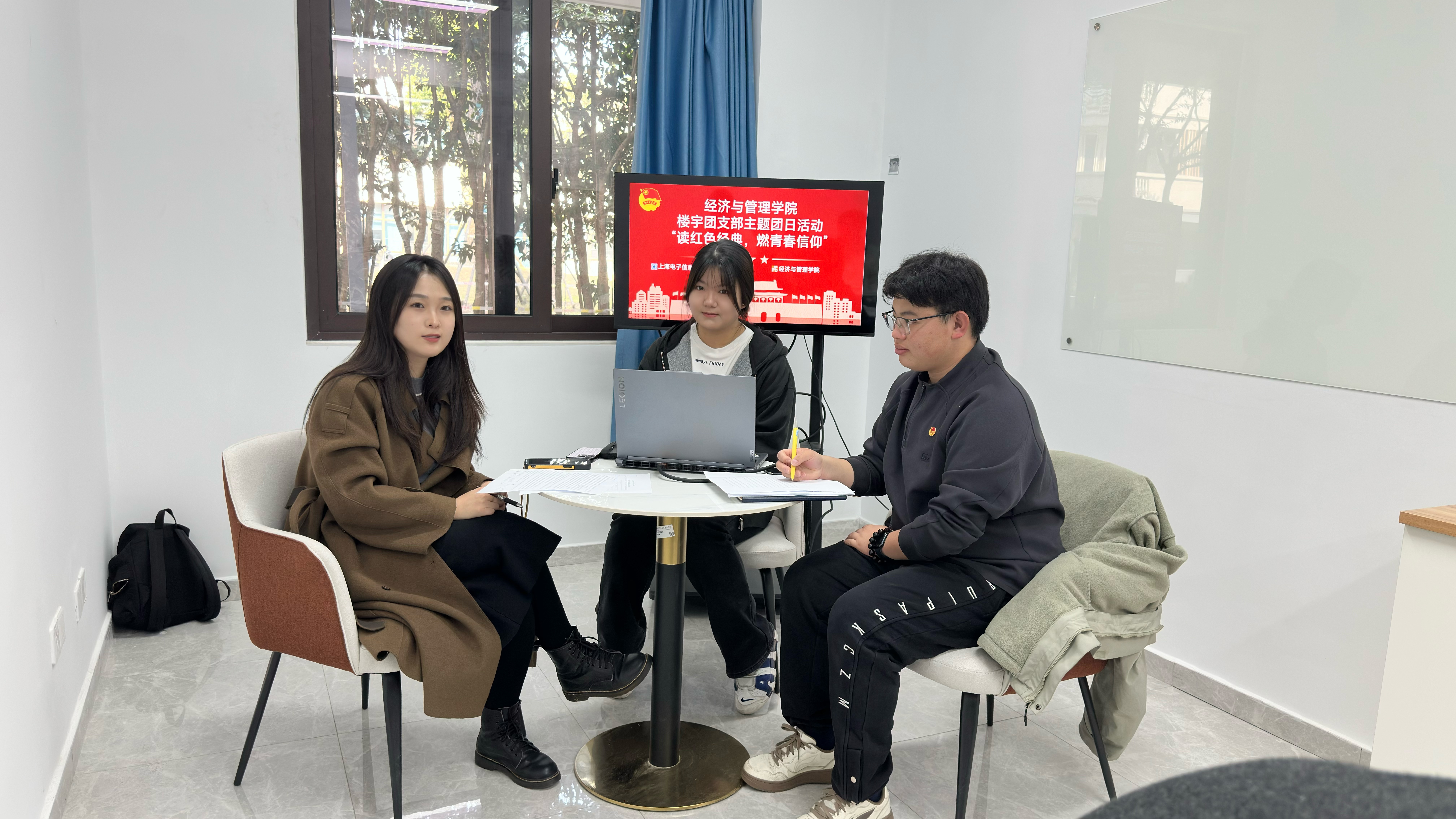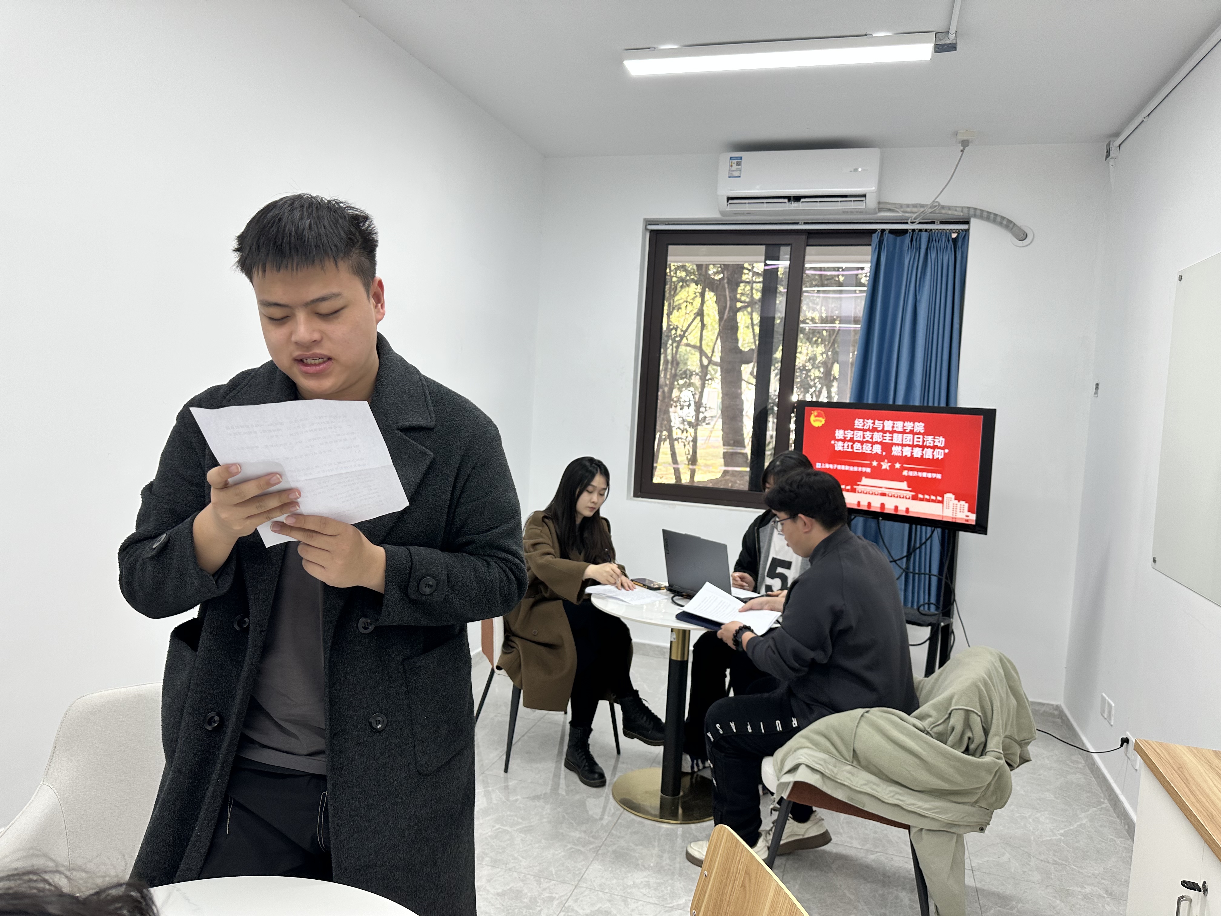 2025年12月11日中午,经济与管理学院团总支依托6号楼楼宇团支部,在学院“一站式”学生社区活动空间,成功举办了“读红色经典,燃青春信仰”主题团日活动。活动旨在将思想引领阵地前移到学生生活场域,通过楼宇团支部这一贴近青年的组织抓手,在“一站式”社区内点燃阅读经典、探讨信仰的热潮。学院团总支书记鲍昱含老师与该楼宇团支部的团员青年代表共同参与了本次活动。